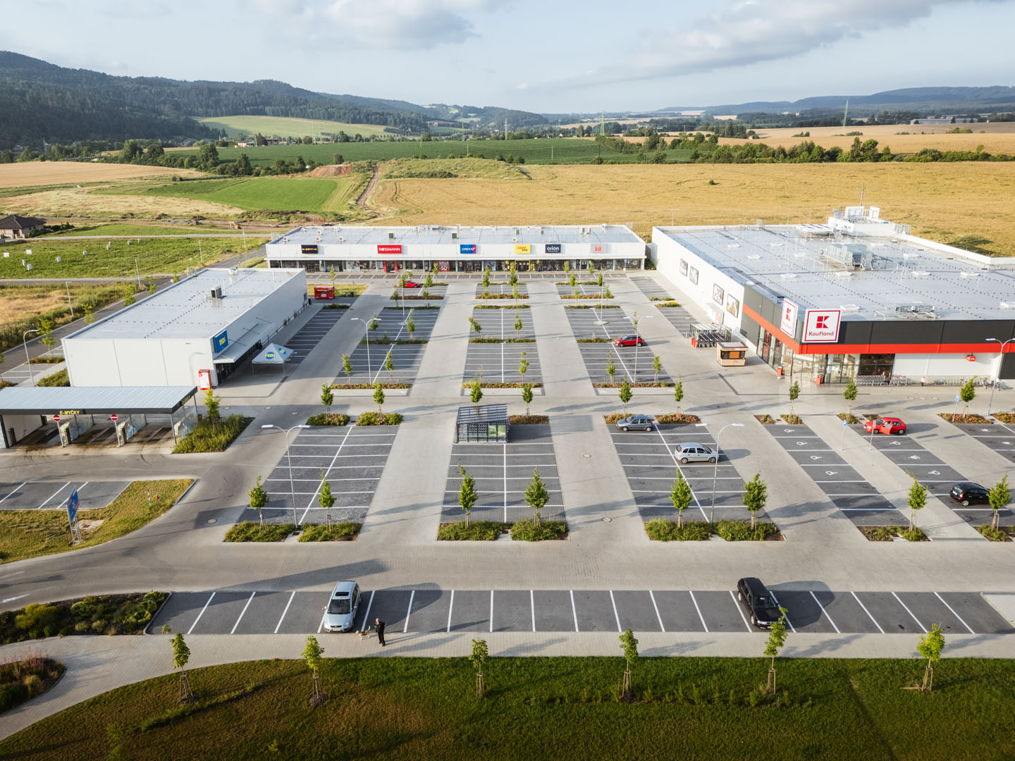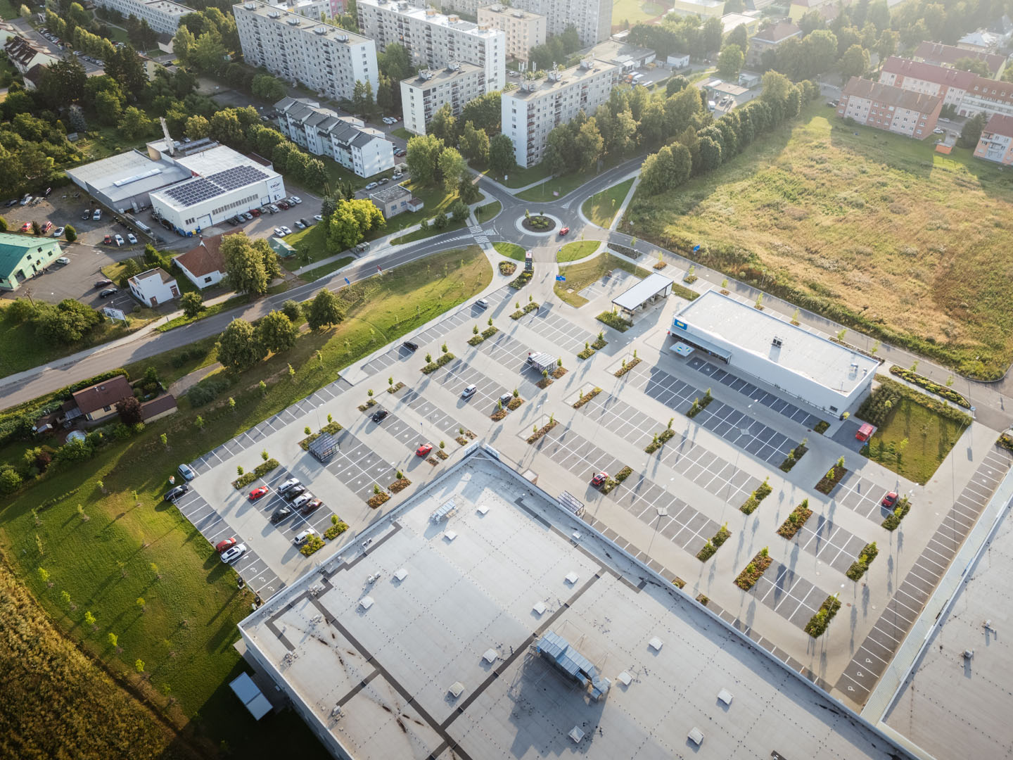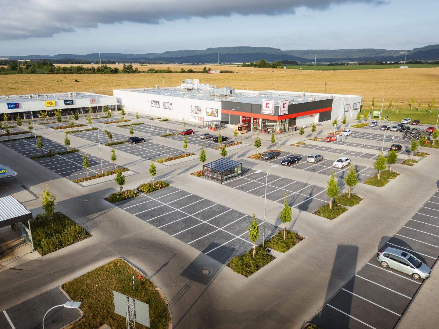Předmětem projektu byl návrh krajinářských úprav pro chystanou výstavbu obchodního nákupního centra. Od počátku projektu byla snaha o maximální možné uplatnění stromů a důraz na řešení zelenomodré infrastruktury. Vedle adaptace plochy na klimatickou změnu, bylo cílem také posílit obyvatelnost prostoru a jeho začlenění do širšího okolí.